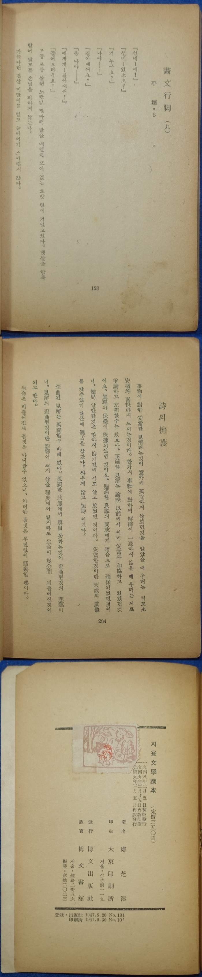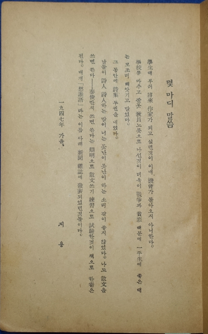 <³»¿ë> 1949³â ¼¿ï ÚÏÙþõó÷úÞä ¹ßÇà ï÷ò¹éÁ îÊ [Áö¿ë ¹®Çе¶º»(ÙþùÊÔÁÜâ)] ÀçÆÇº»À¸·Î ÀüÅëÀû Á¤¼¸¦ ¼¶¼¼ÇÏ°í ¾Æ¸§´Ù¿î ½Ã¾î·Î Ç¥ÇöÇØ³½ ¼Á¤½ÃÀÎ Á¤Áö¿ë(1902~?)ÀÇ »ê¹® ¸ðÀ½ÁýÀ¸·Î ½Å¹®, ÀâÁö¿¡ ±â°íÇß´ø ¼öÇÊ, ±âÇ๮, Æò·Ð µîÀ» ¸ð¾Æ³õÀº Ã¥ÀÌ´Ù. <Å©±â> 12.5¡¿18.3cm